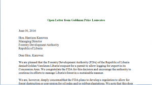 Publication date Thursday, June 30, 2016 - 12:00 Publication document Open Letter from Goldman Prize Laureates.pdf (188.51 KB) A host of Golden Environmental Prize winners send a letter to Liberia's Forest Development Authority (FDA) expressing their concerns at the FDA's plan to legalize conversion timber and its potential impact on Liberia's forests. Related Programme Community Rights and Corporate Governance