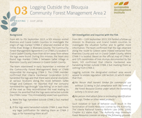 This briefing paper asserts that "Logging without a permit or outside a logging contract area or concession is illegal". The Forestry Development Authority has committed to "formulate a regulation ensuring forestry legal requirements are followed regarding felling of logs alongside access road leading into a concession area" from SDI’s publication Logging Outside the Blouquia Community Forest Management Area 2.